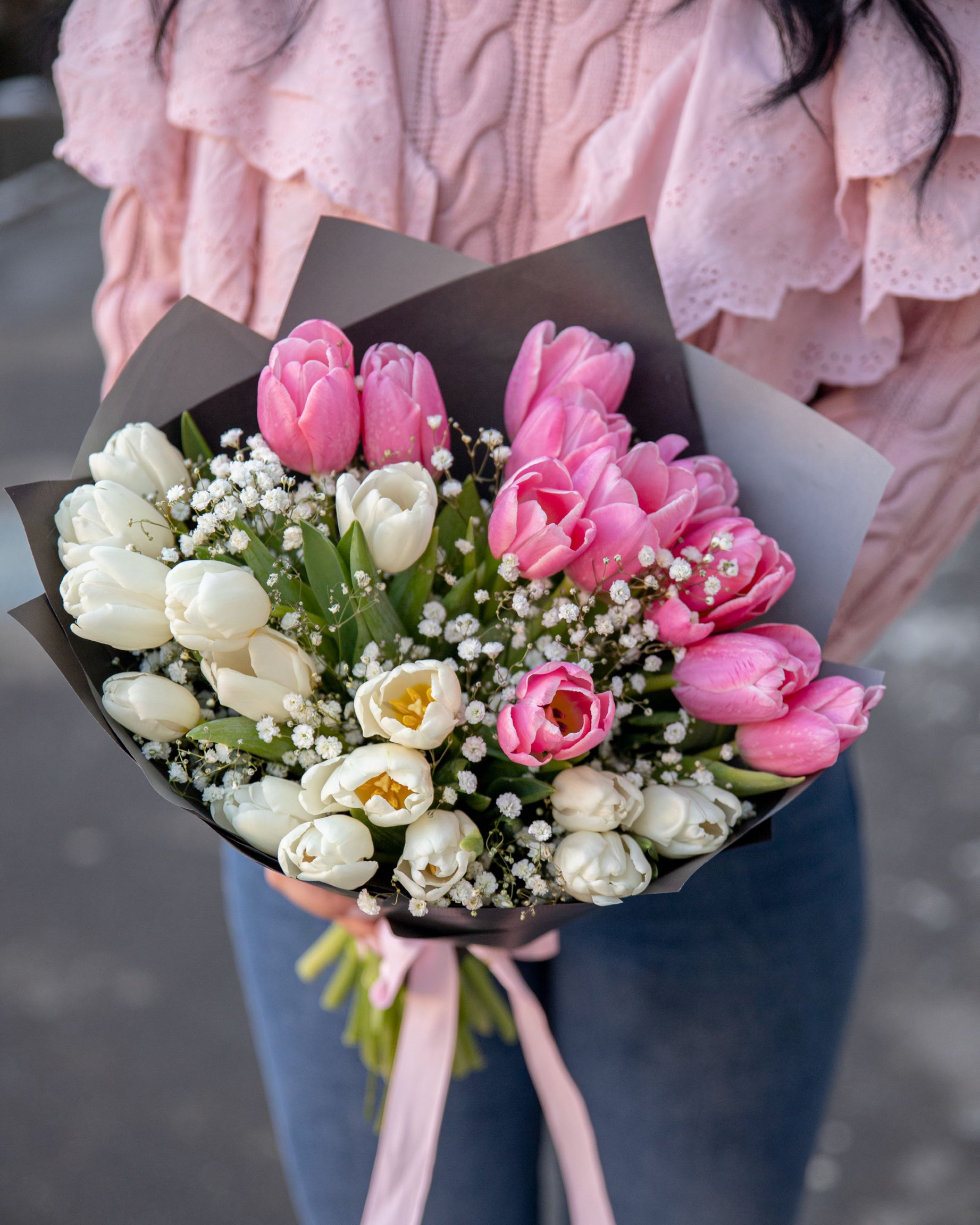 Un buchet monocrom transmite echilibru si stil. Un mix de flori de primavara aduce dinamism si prospetime. Alegerea depinde de mesajul pe care vrei sa il transmiti.