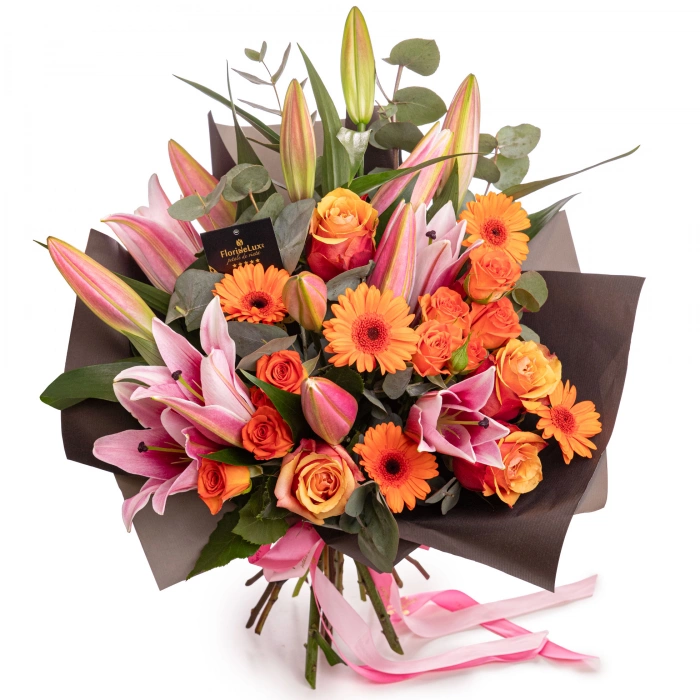 Buchet cu crini si trandafiri portocalii- Perfect pentru persoane energice, vesele si optimiste. Culoarea vibranta transmite entuziasm si bucurie – recomandat pentru o sarbatorita cu personalitate solara.