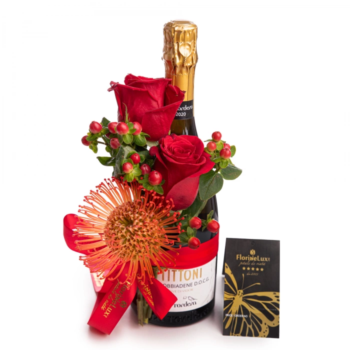 Aranjament cu sticla de Prosecco- alegerea ideala pentru personalitati creative si sofisticate. Cadou premium, modern, potrivit pentru o Andreea sau un Andrei care adora surprizele deosebite.